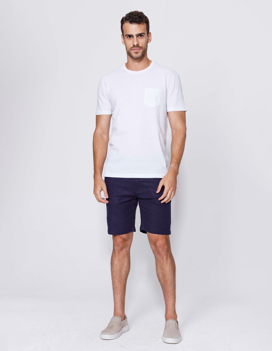 Bermuda chino em tecido misto de linho, viscose e elastano com dois bolsos frontais e dois bolsos traseiros embutidos e modelagem confortável, básica, com comprimento logo acima do joelho