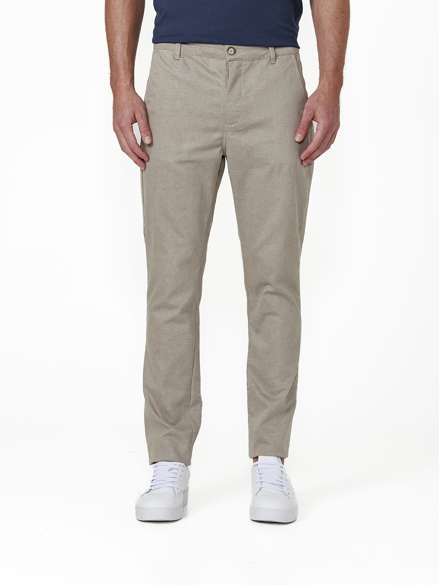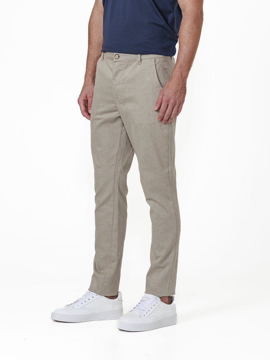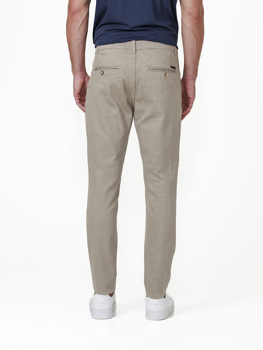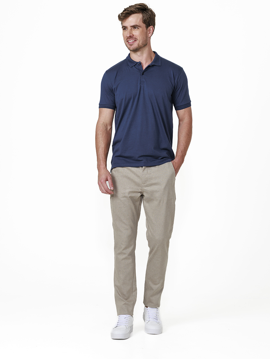 A Calça Chino é confeccionada em sarja de composição mista com algodão, poliéster e elastano, unindo resistência, maciez e flexibilidade.