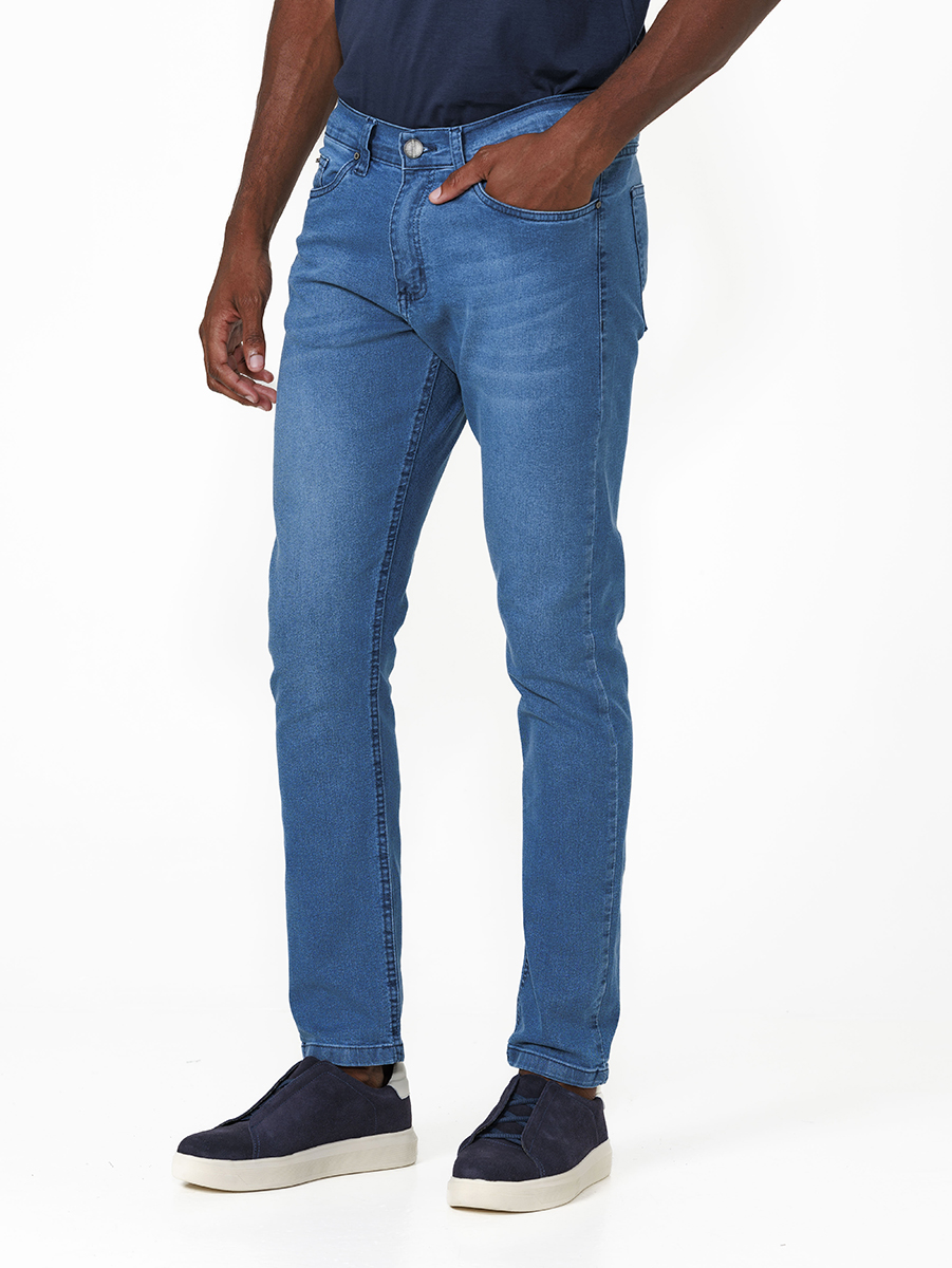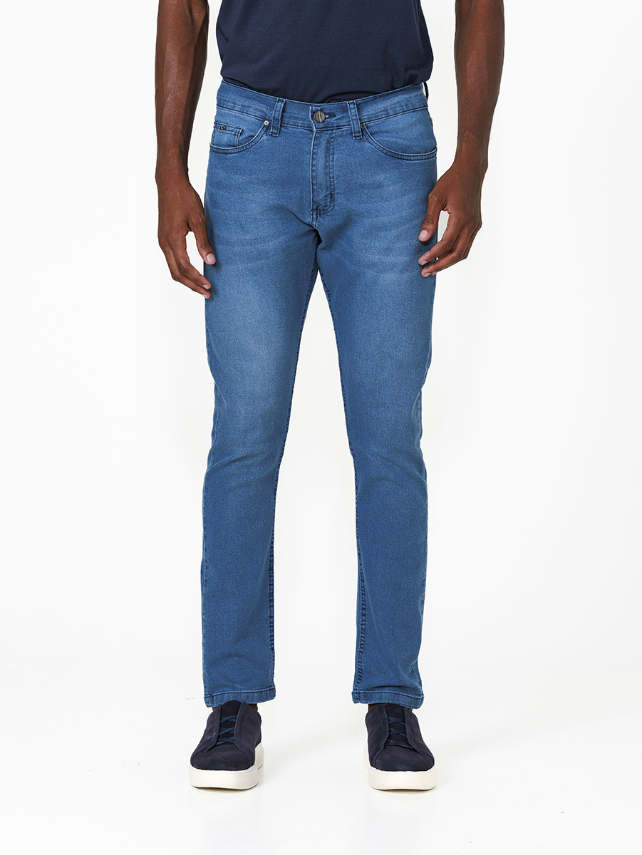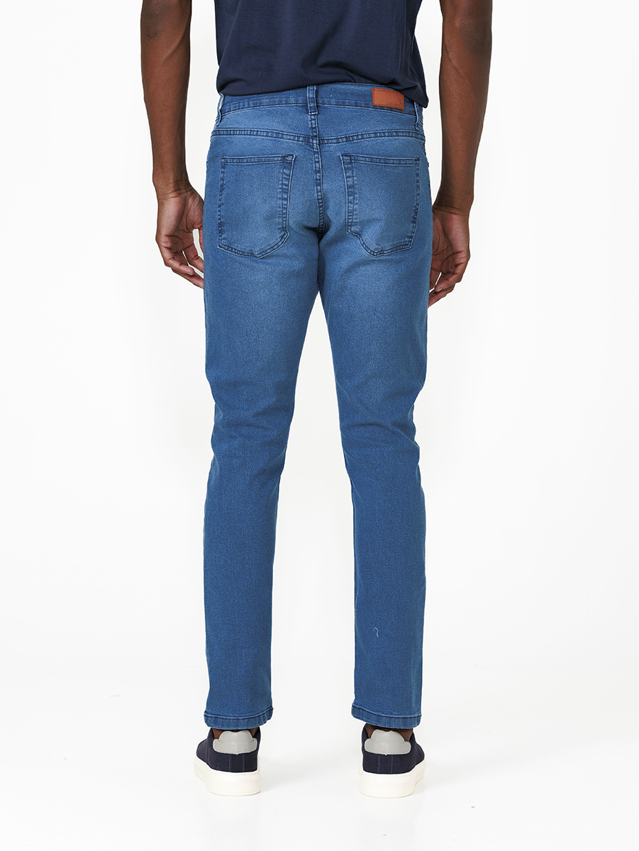 A Calça Jeans Mid Blue apresenta lavagem com tom azul médio, que simula o desgaste natural da peça, com marcações suaves que adicionam autenticidade ao visual.