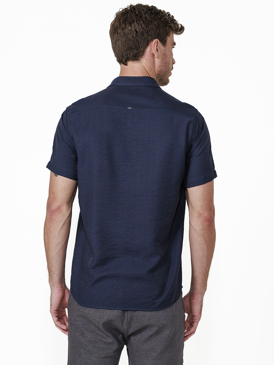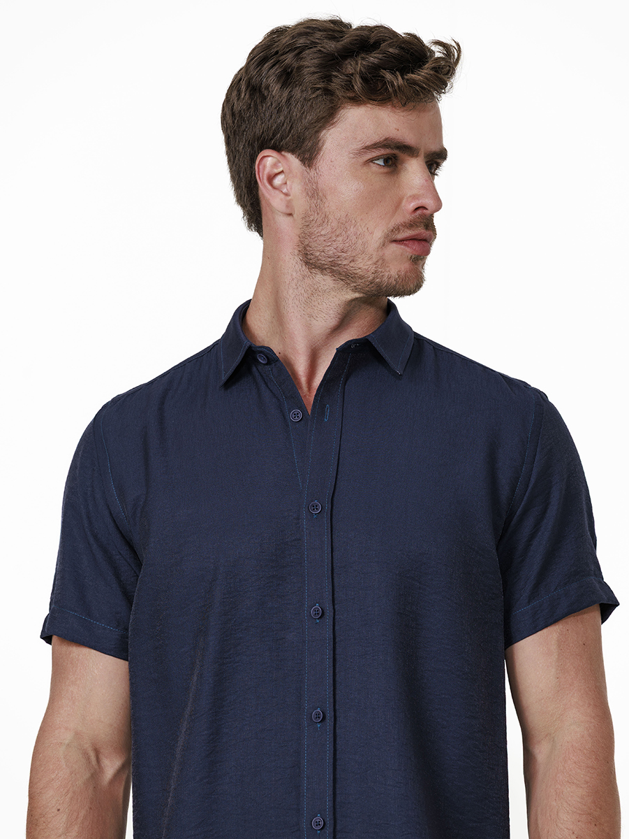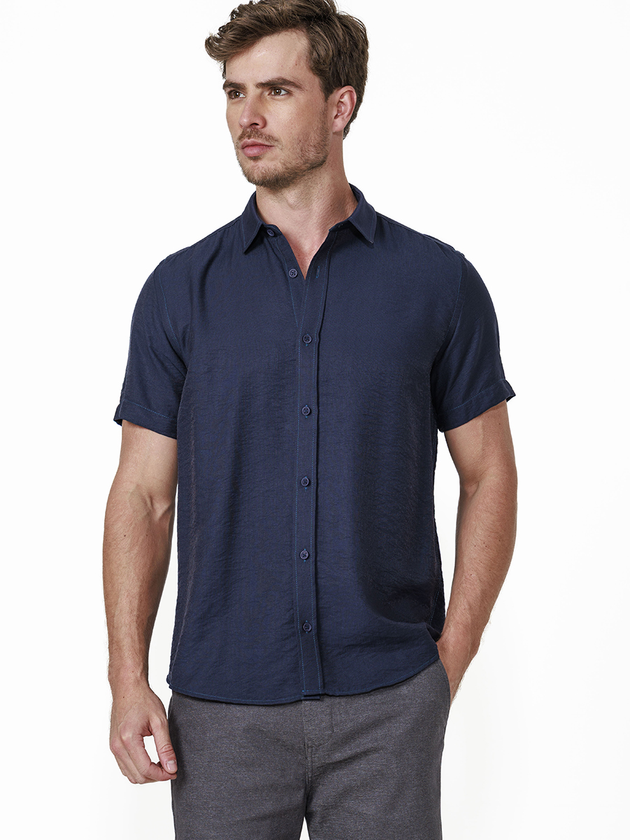 Essa camisa é confeccionada em tecido de viscose com poliamida, que se destaca pela textura diferenciada, pelo frescor e pela sensação de leveza ao vestir.