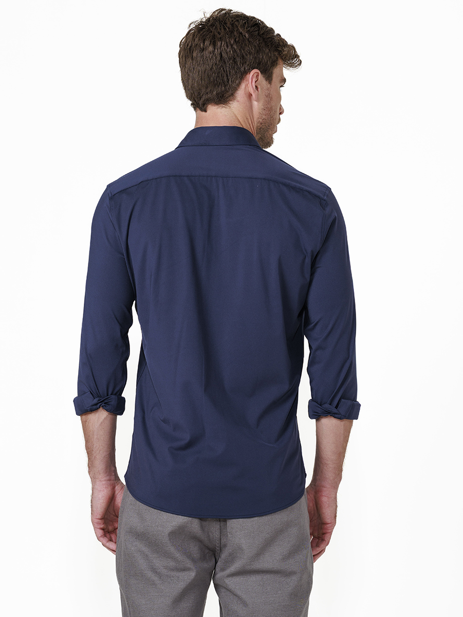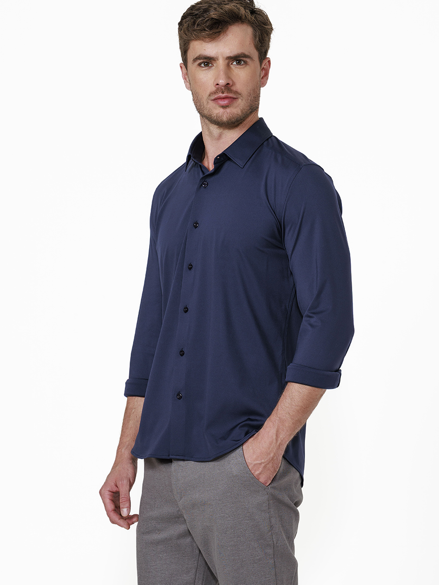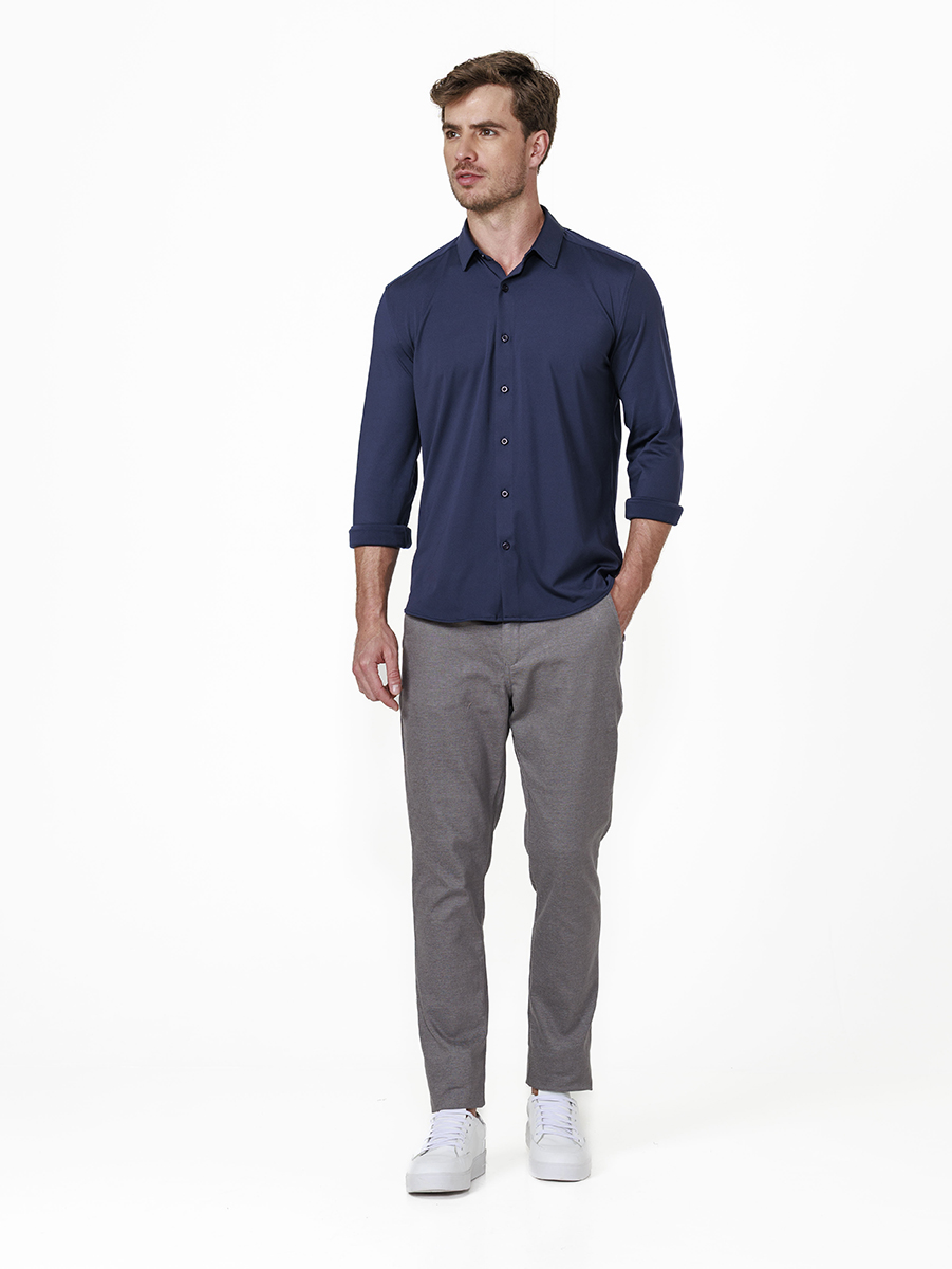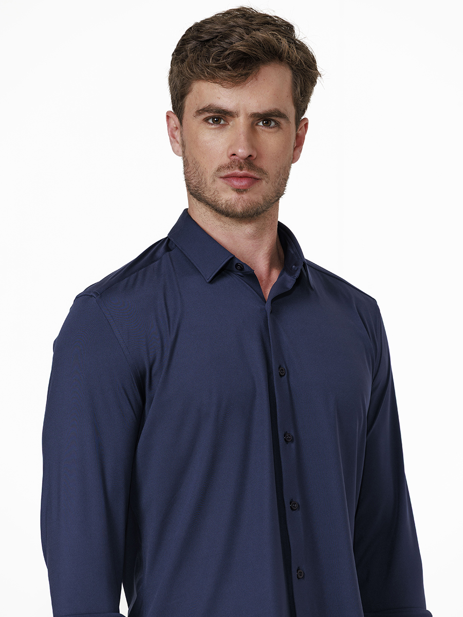 Alfaiataria Inteligente! Esta camisa é feita com fibras tecnológicas, compostas por 85% Poliamida e 15% Elastano, oferecendo uma experiência totalmente nova ao vestir camisas.