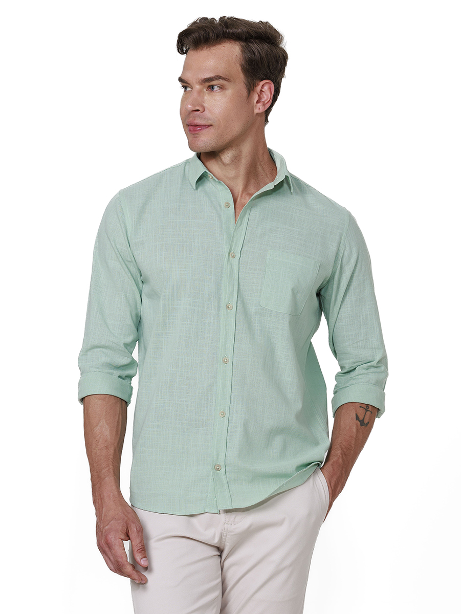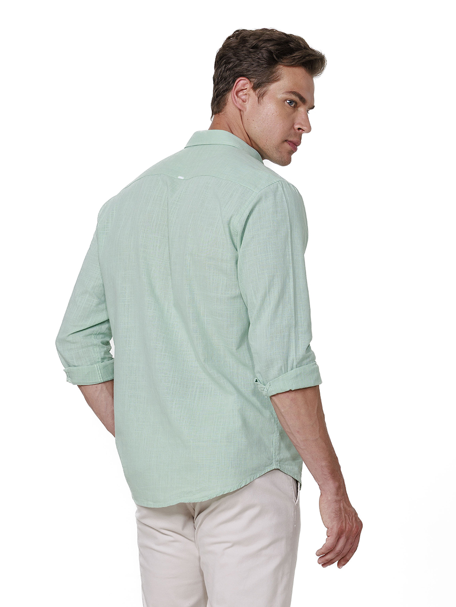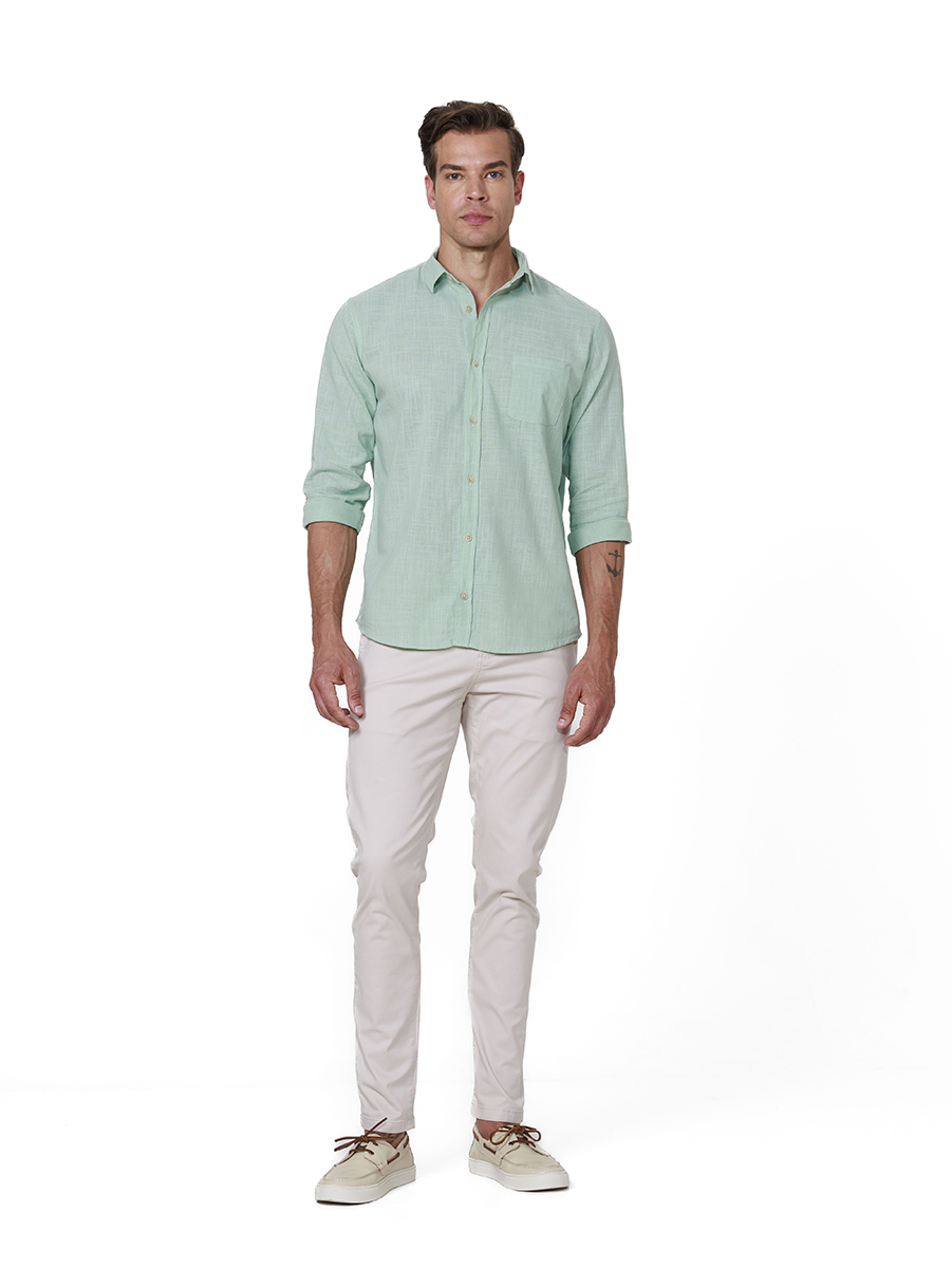 A Camisa Slub, confeccionada em 100% algodão, destaca-se pela trama mais aberta e pela mistura de fios finos e fios flamês rajados em sua construção. Modelagem Slim Fit
