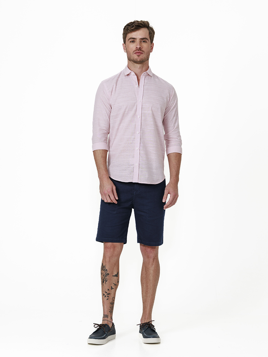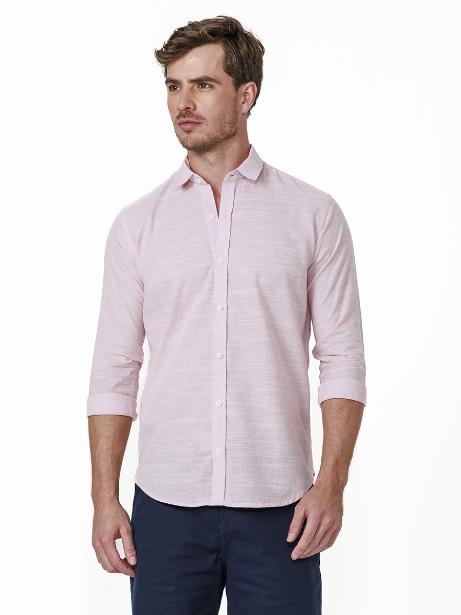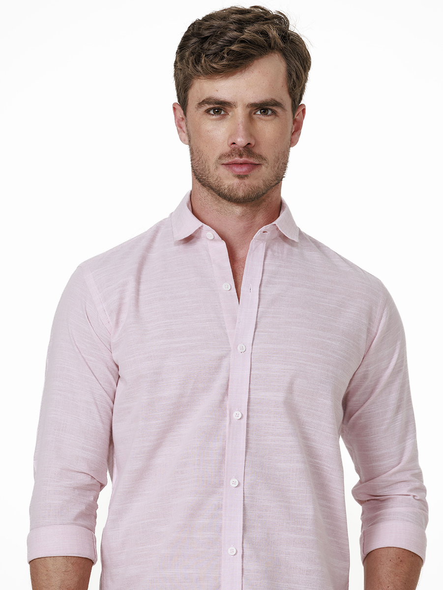 A Camisa Slub, confeccionada em 100% algodão, destaca-se pela trama mais aberta e pela mistura de fios finos e fios flamês rajados em sua construção.
