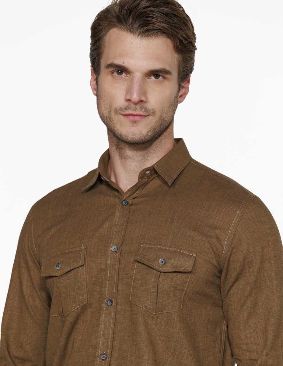 Possui dois bolsos frontais com pense e lapela, com fechamento em botão