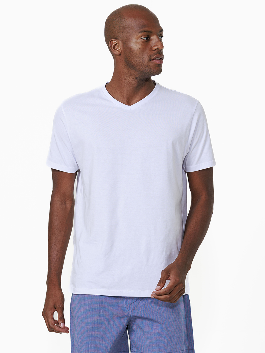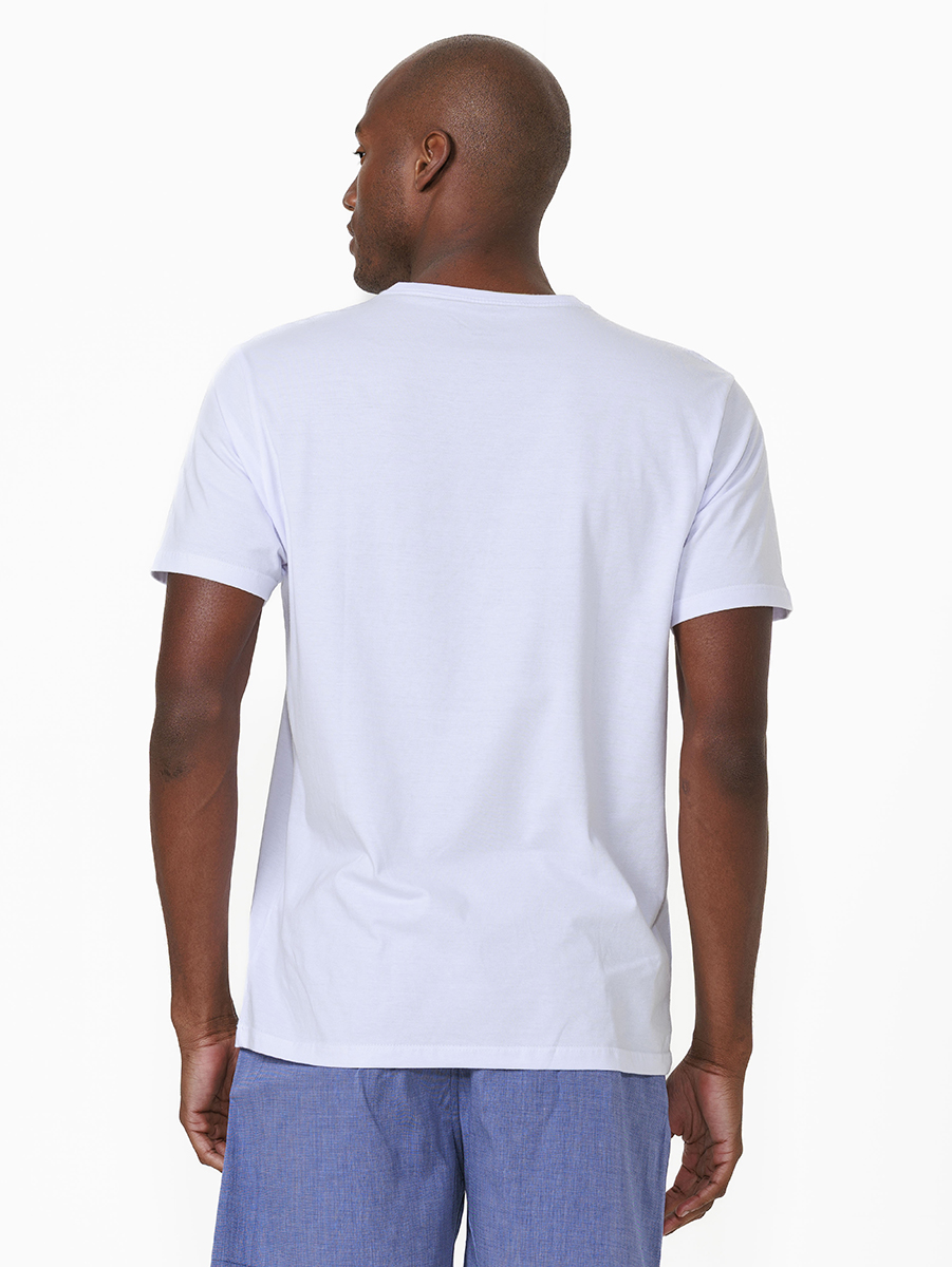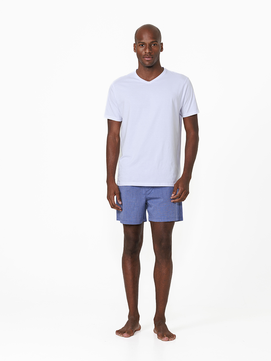 O conjunto inclui uma camiseta de malha branca fio 30.1 penteado, macia e leve, combinada com short confeccionado em tecido fio a fio, que traz toque suave e visual despojado.