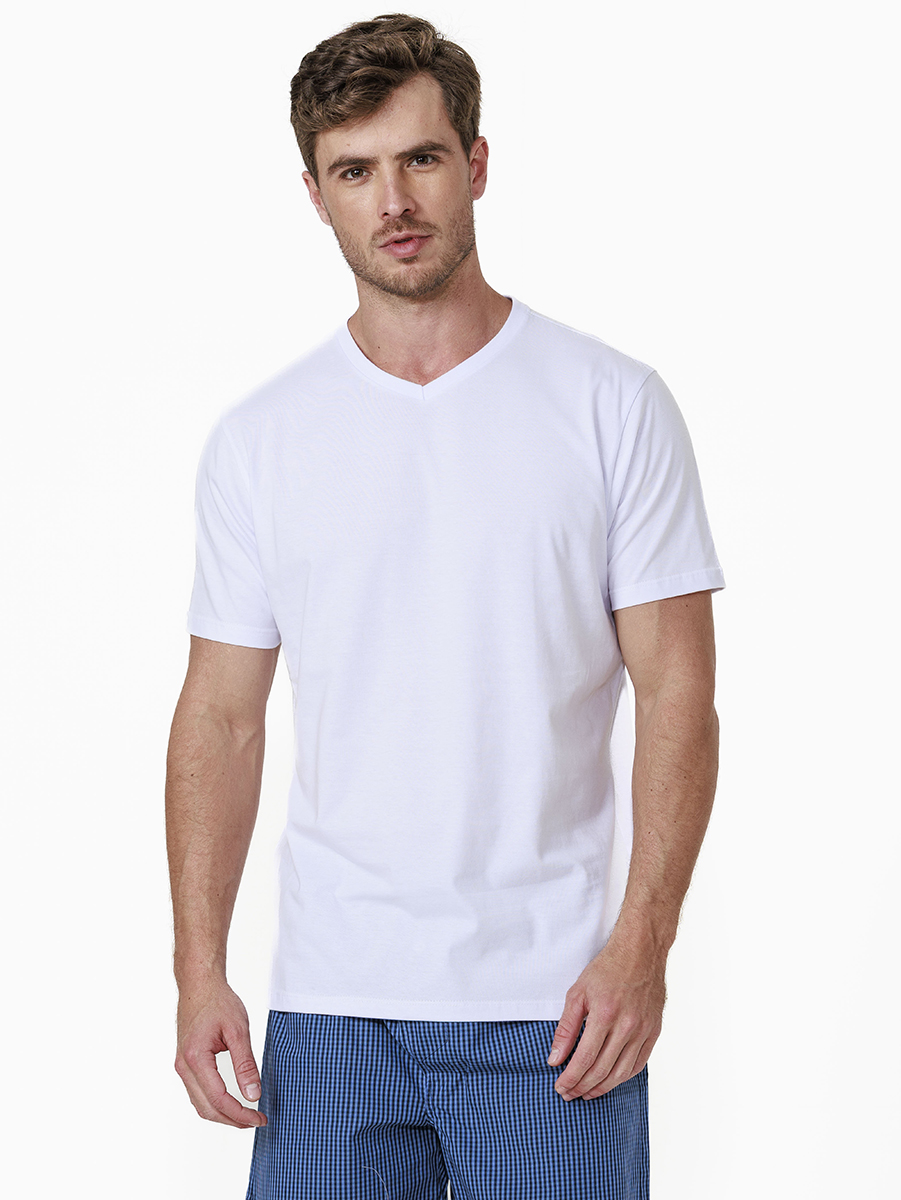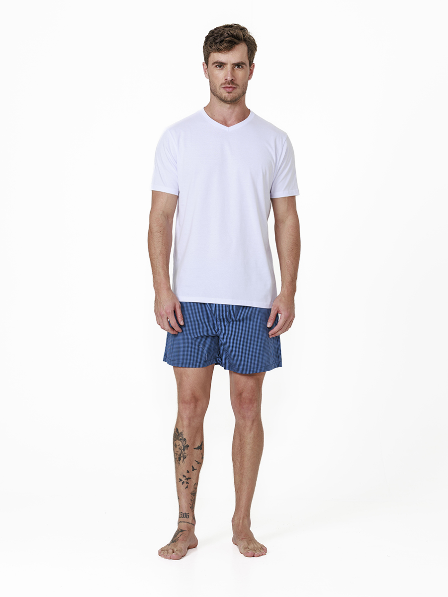 O conjunto inclui uma camiseta de malha branca fio 30.1 penteado, macia e leve, combinada com short confeccionado em tecido vichy, que traz toque suave e visual despojado.