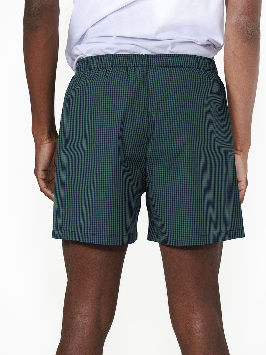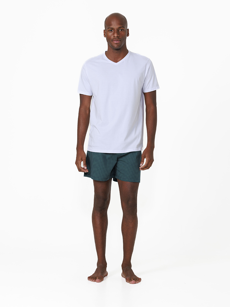 O conjunto inclui uma camiseta de malha branca fio 30.1 penteado, macia e leve, combinada com short confeccionado em tecido vichy, que traz toque suave e visual despojado.