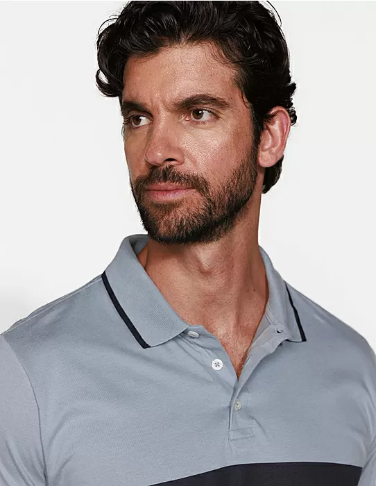 Polo em tecido de algodão, macio e fresco. O detalhe na gole e magas e a listra central em cor contrastante trás estilo à peça sem perder o conforto.