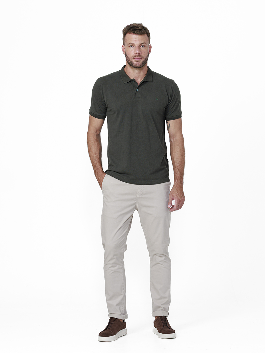 A textura característica do piquet traz um visual clássico e atemporal, ideal para composições casuais com aparência mais arrumada.
