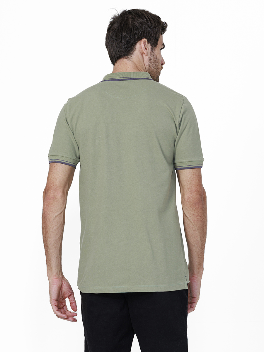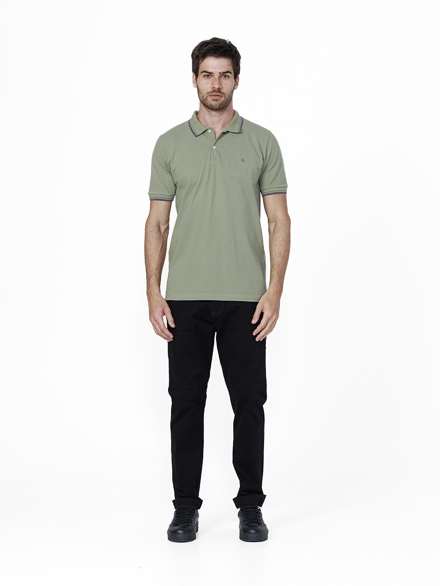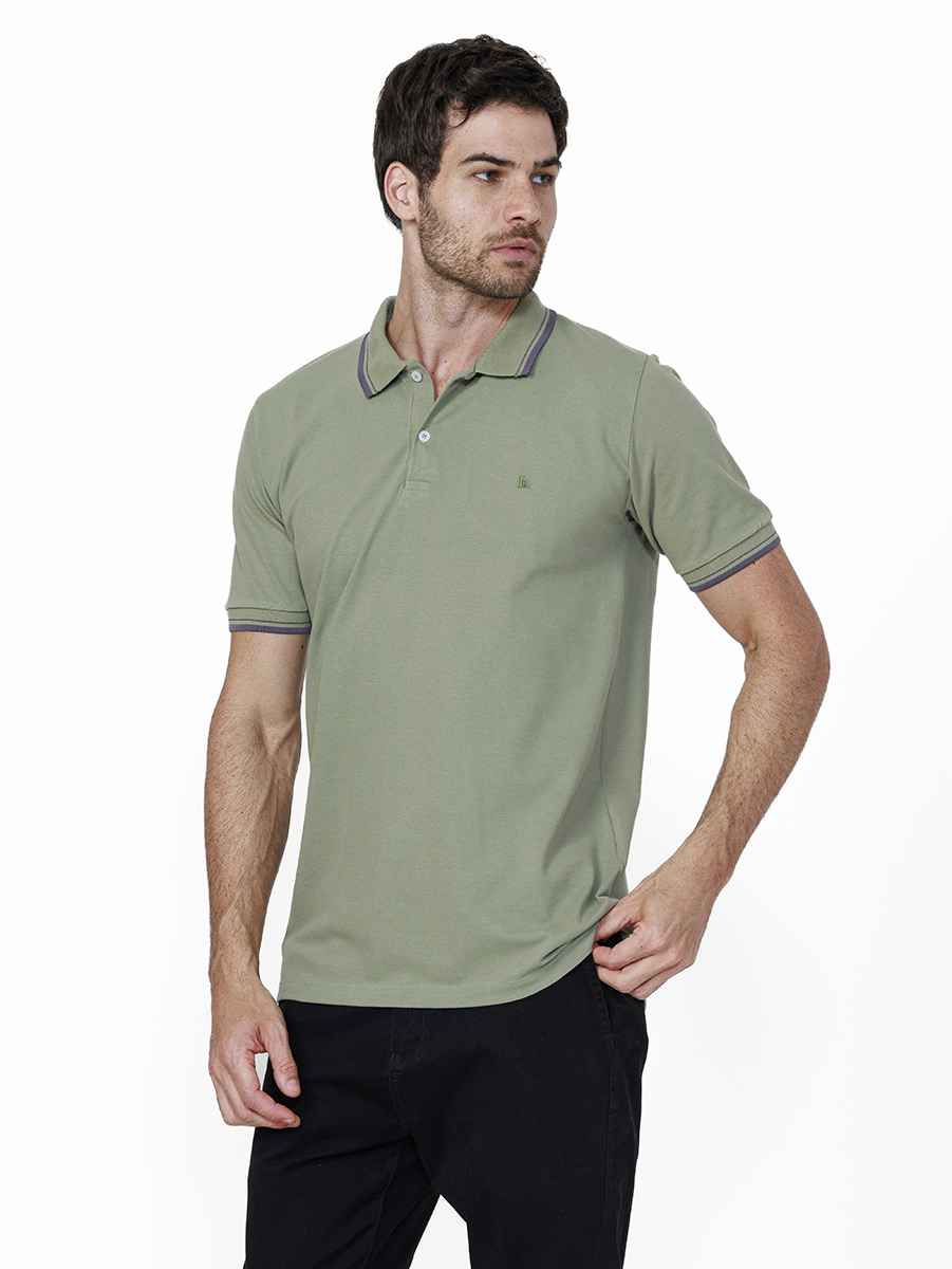 A textura característica do piquet reforça o estilo da peça, enquanto os frisos na gola e nos punhos adicionam um detalhe de contraste.