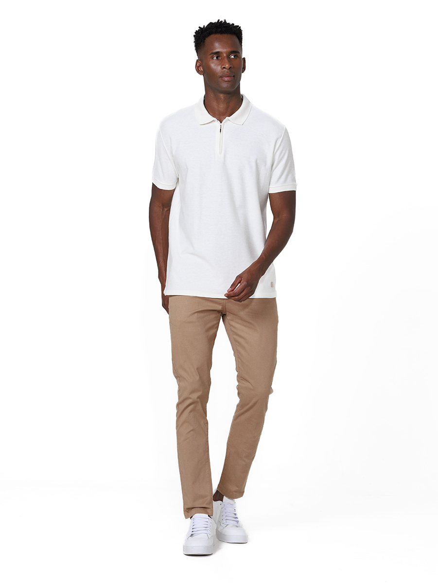 Seu visual com textura diagonal, inspirado no aspecto tradicional da sarja tecida, traz um diferencial marcante, unindo praticidade da malha com uma estética mais estruturada. Modelagem Classic Fit.