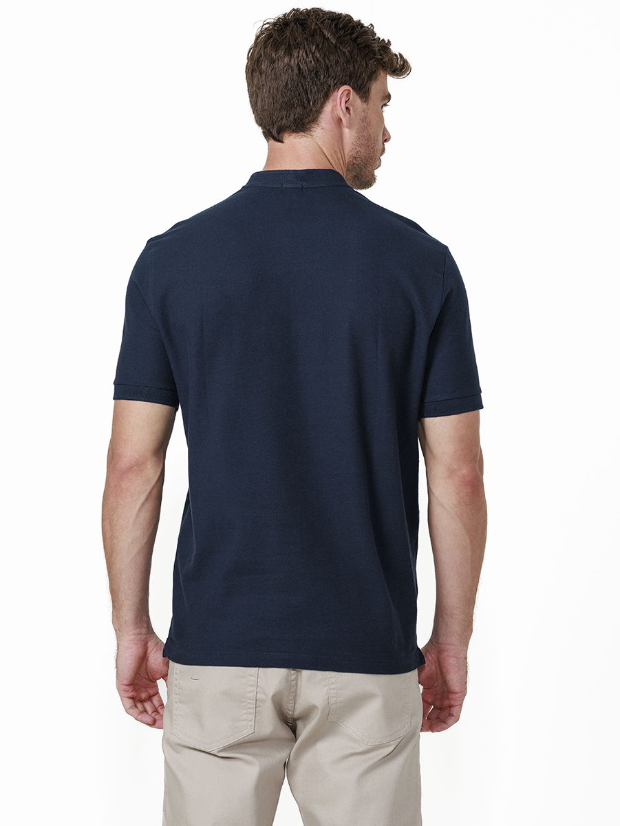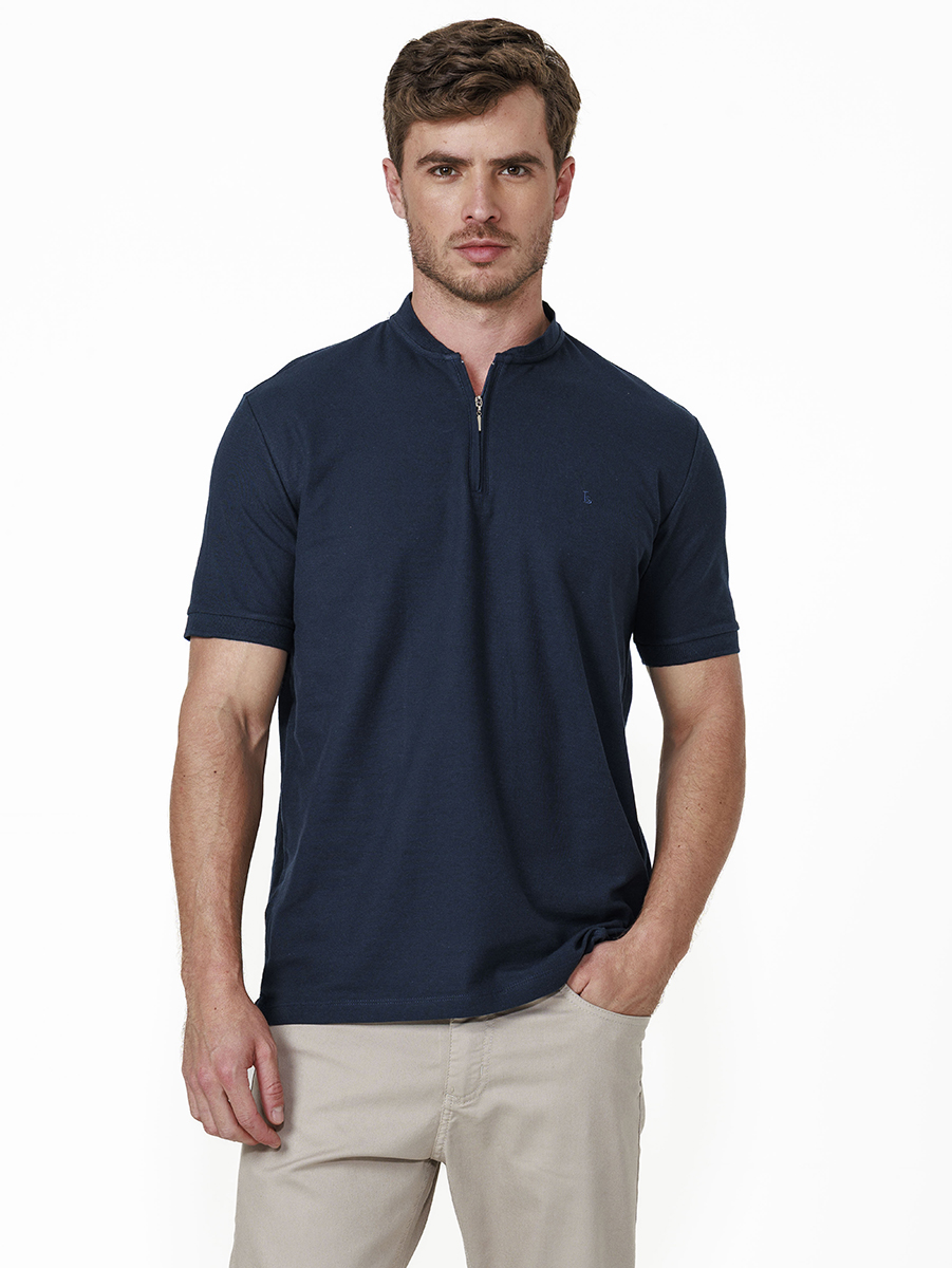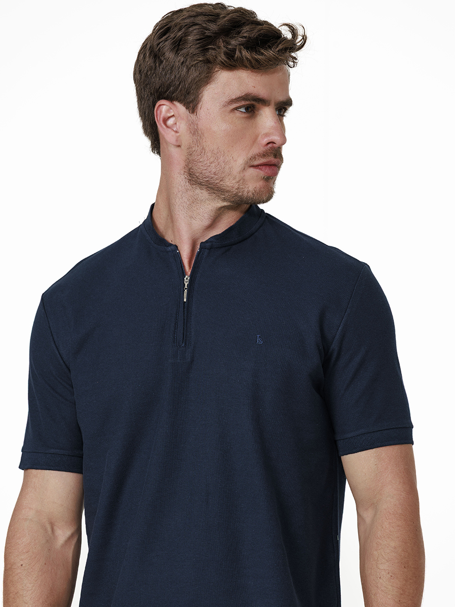 Confeccionada em 100% algodão com micro textura, a peça se diferencia das clássicas polos pelo detalhe do zíper de metal e pela gola padre canelada.