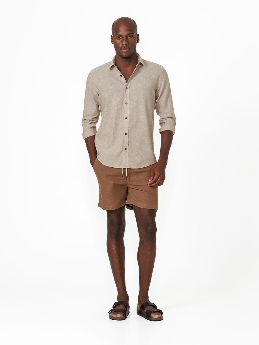 Confeccionado em tecido de blend de fibras e linho, proporciona leveza, toque macio e excelente caimento, garantindo um visual fluido e moderno.