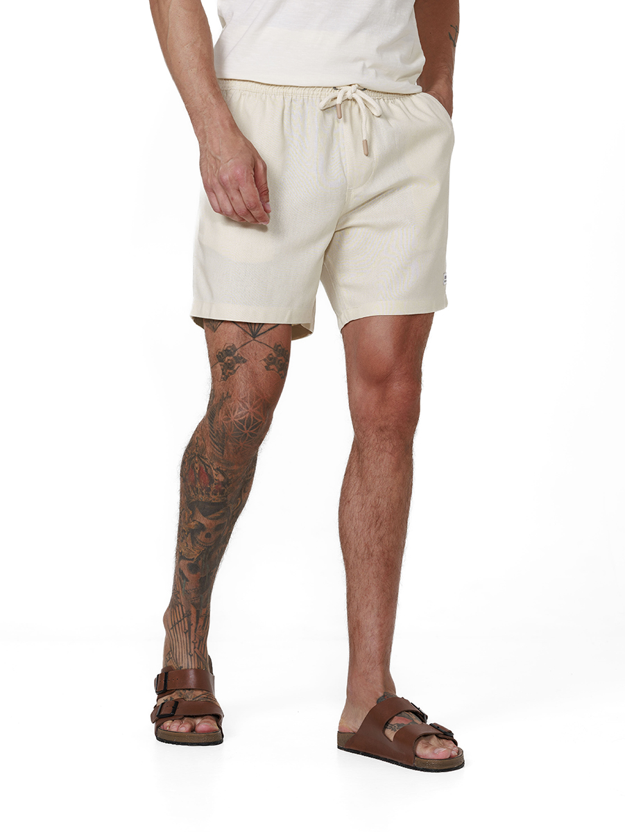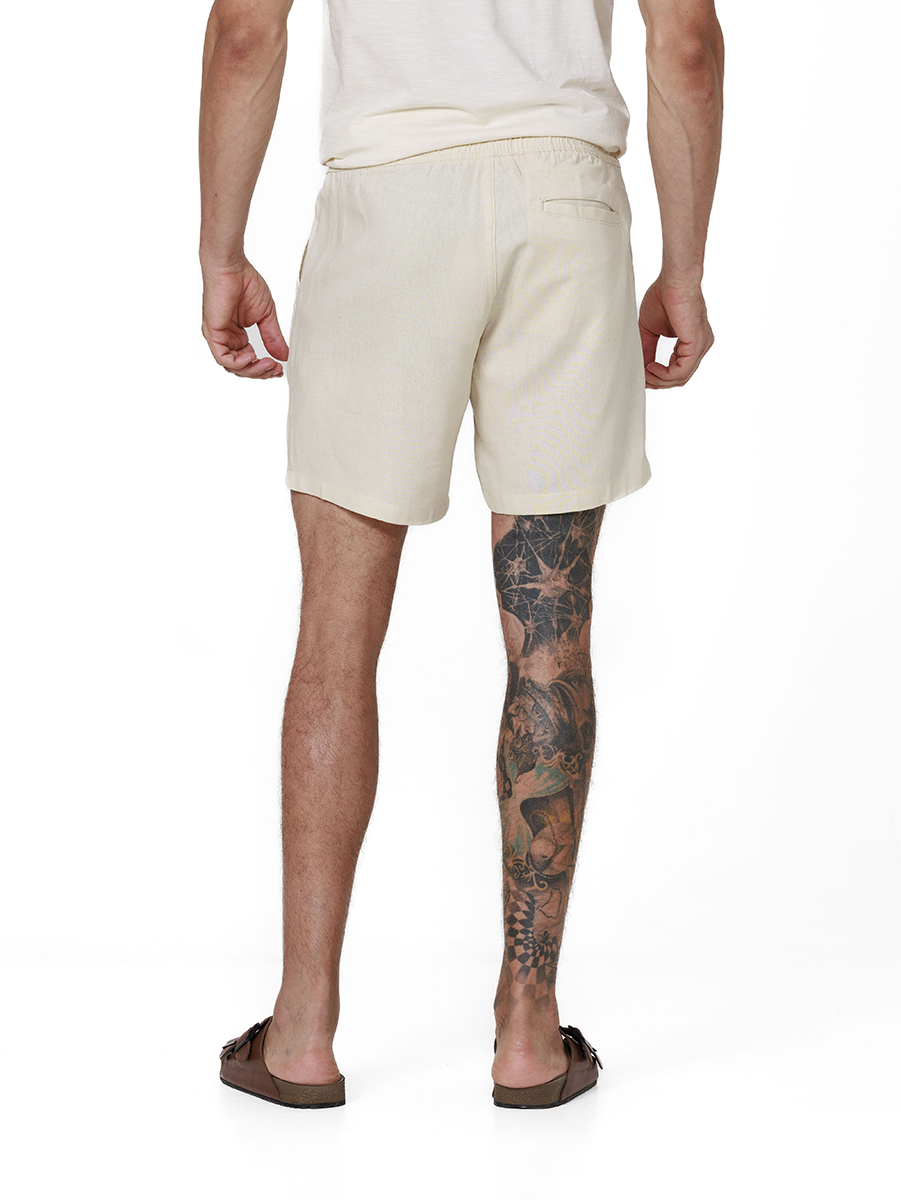 Short com elástico em tecido de blend de fibras, composto por viscose e linho.
