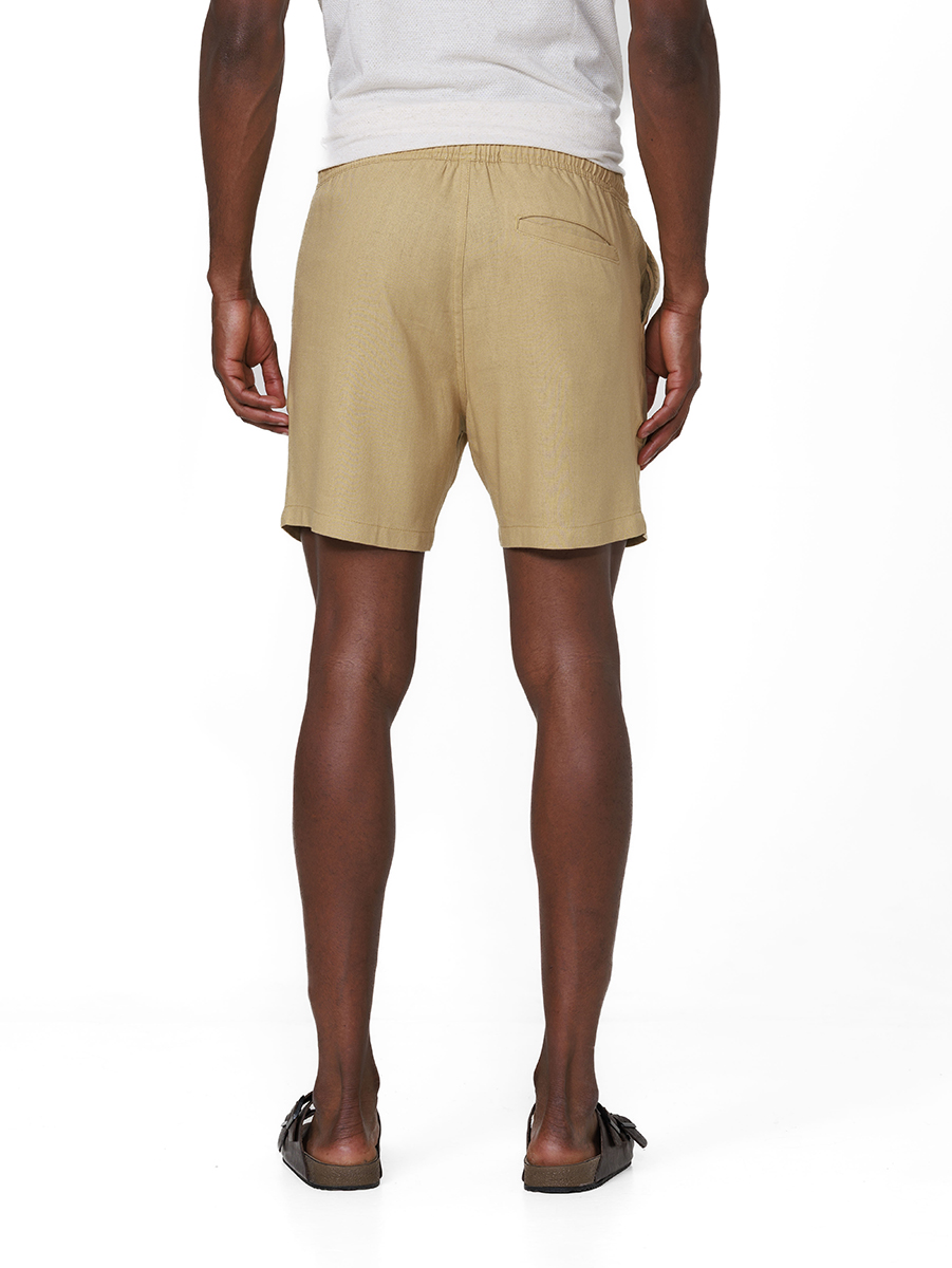 Short com elástico em tecido de blend de fibras, composto por viscose e linho.
