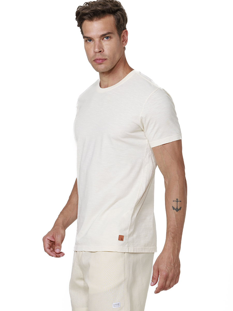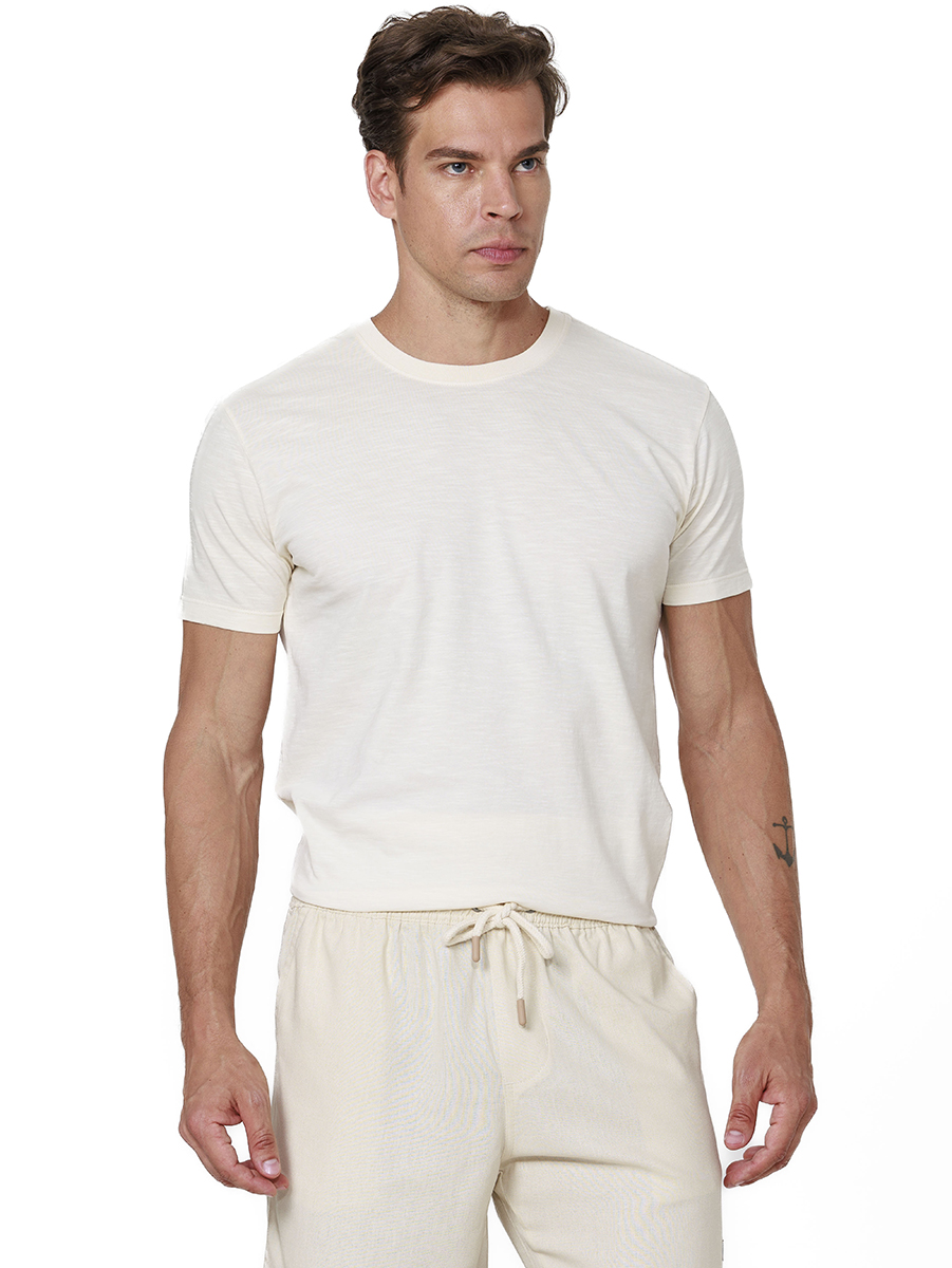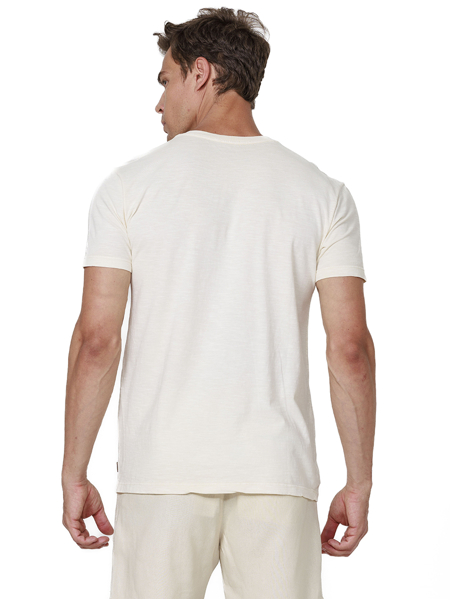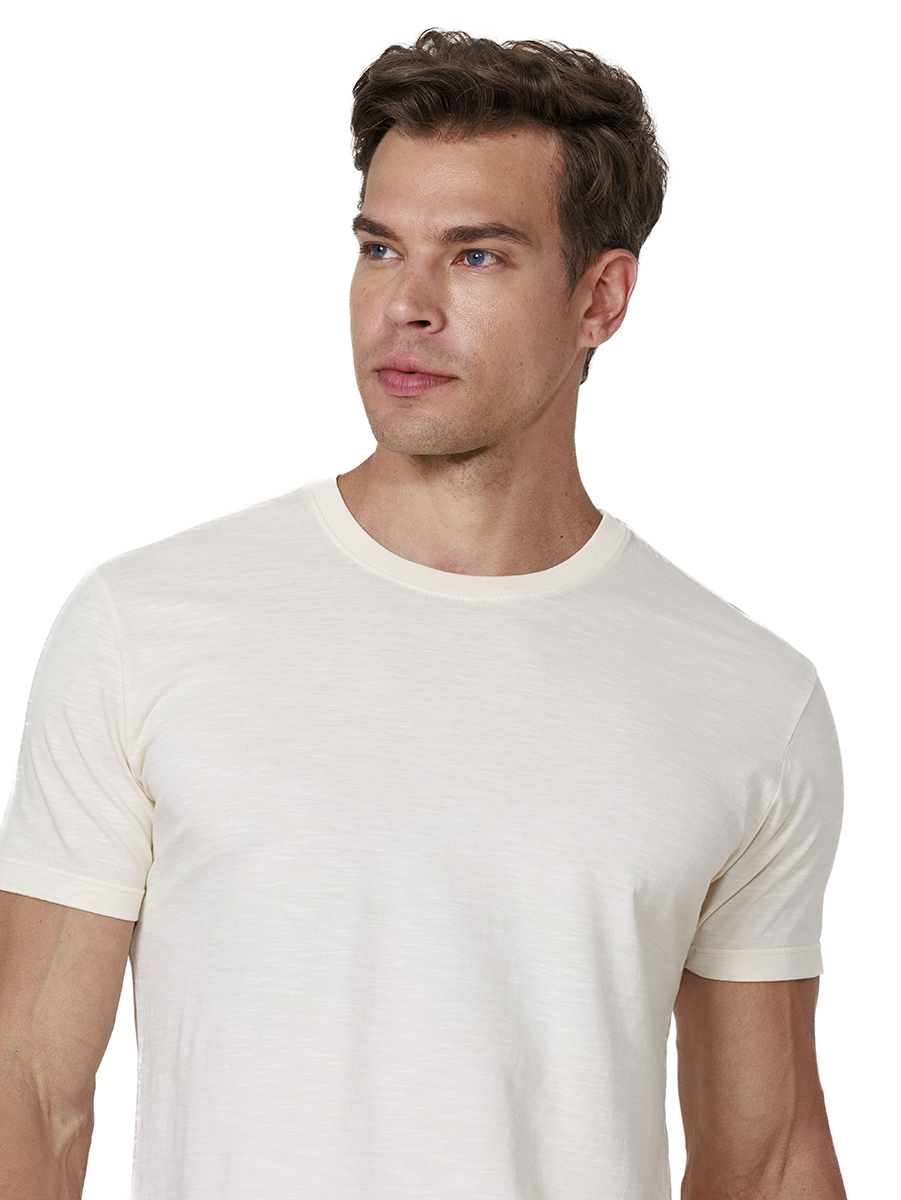 T-shirt em malha flamê, reconhecida pela superfície levemente irregular que traz movimento e naturalidade ao visual.