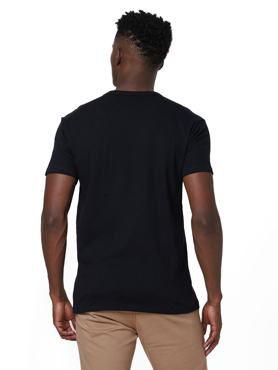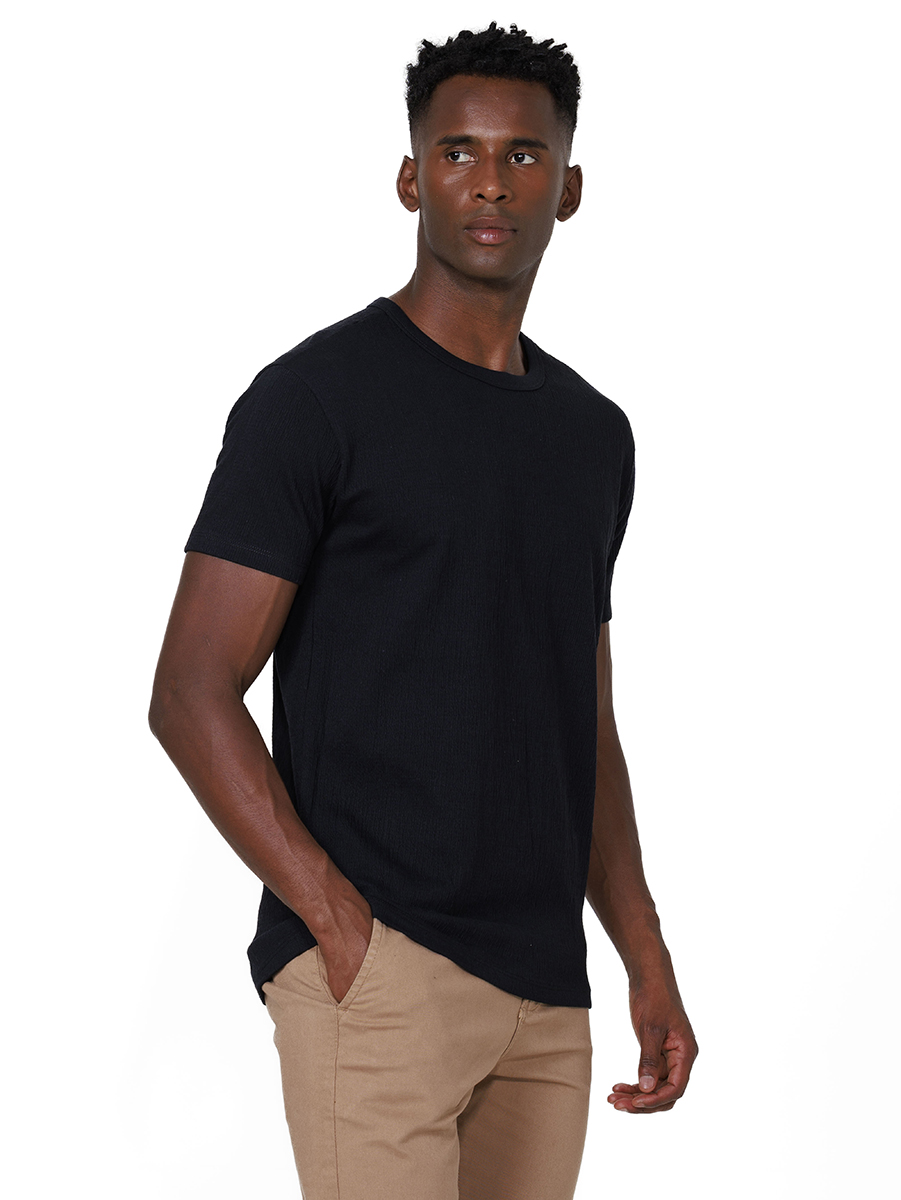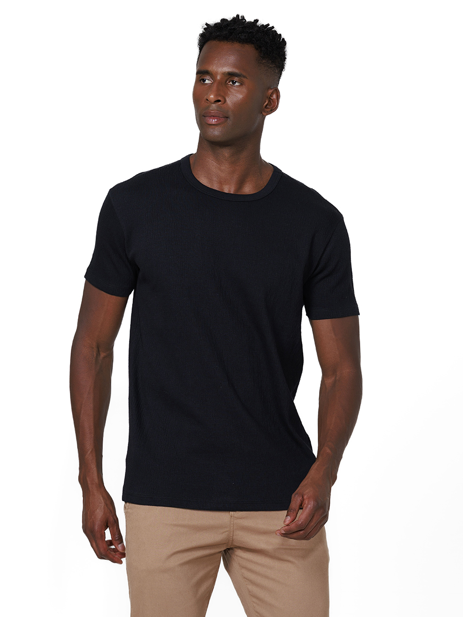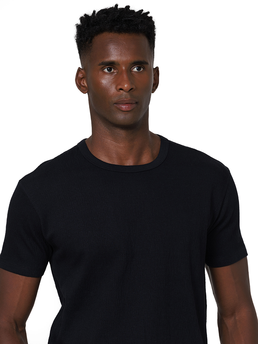Camiseta desenvolvida em malha com textura enrugada marcada, aquela superfície cheia de pequenos relevos que parece guardar movimento próprio.