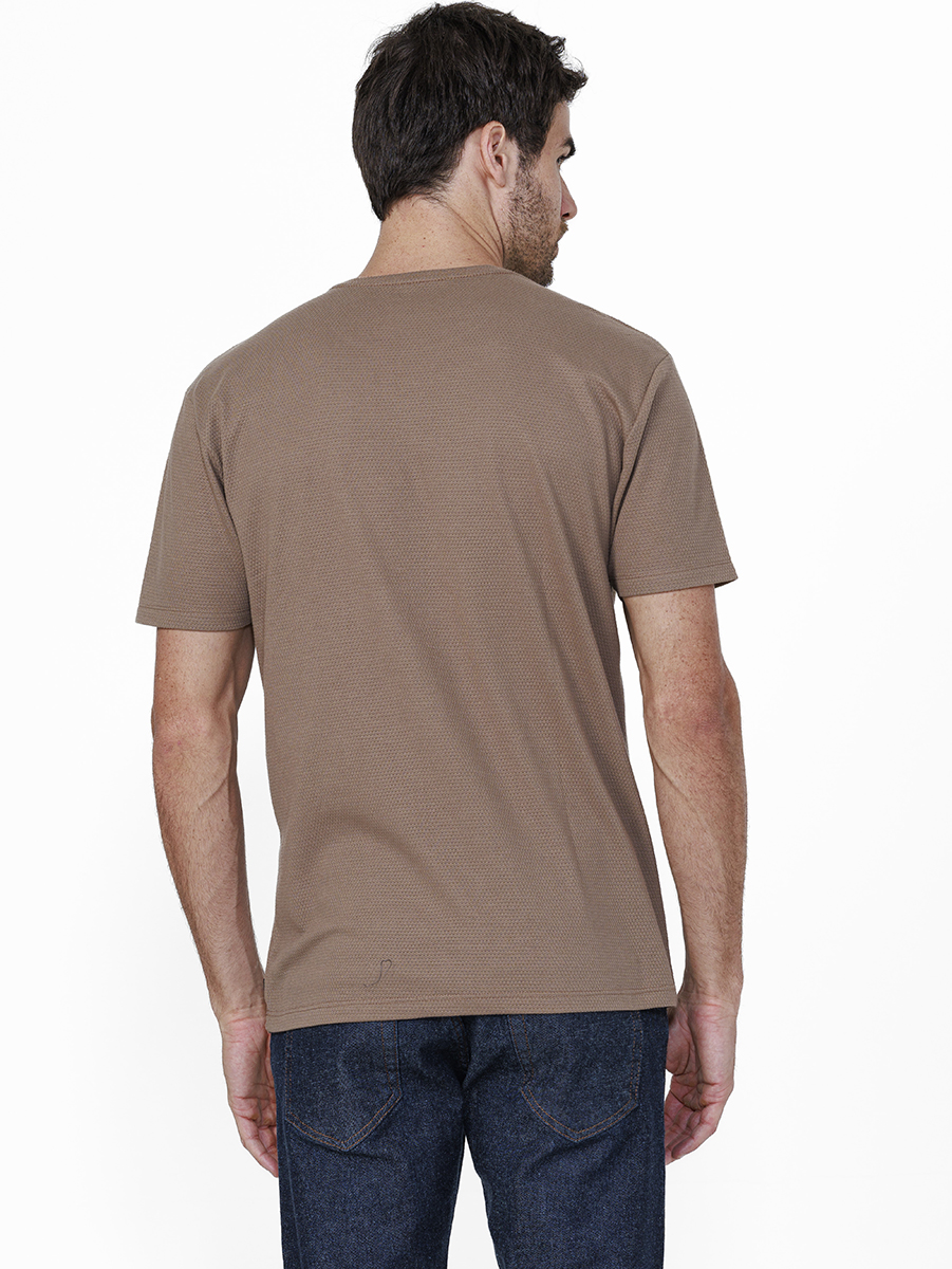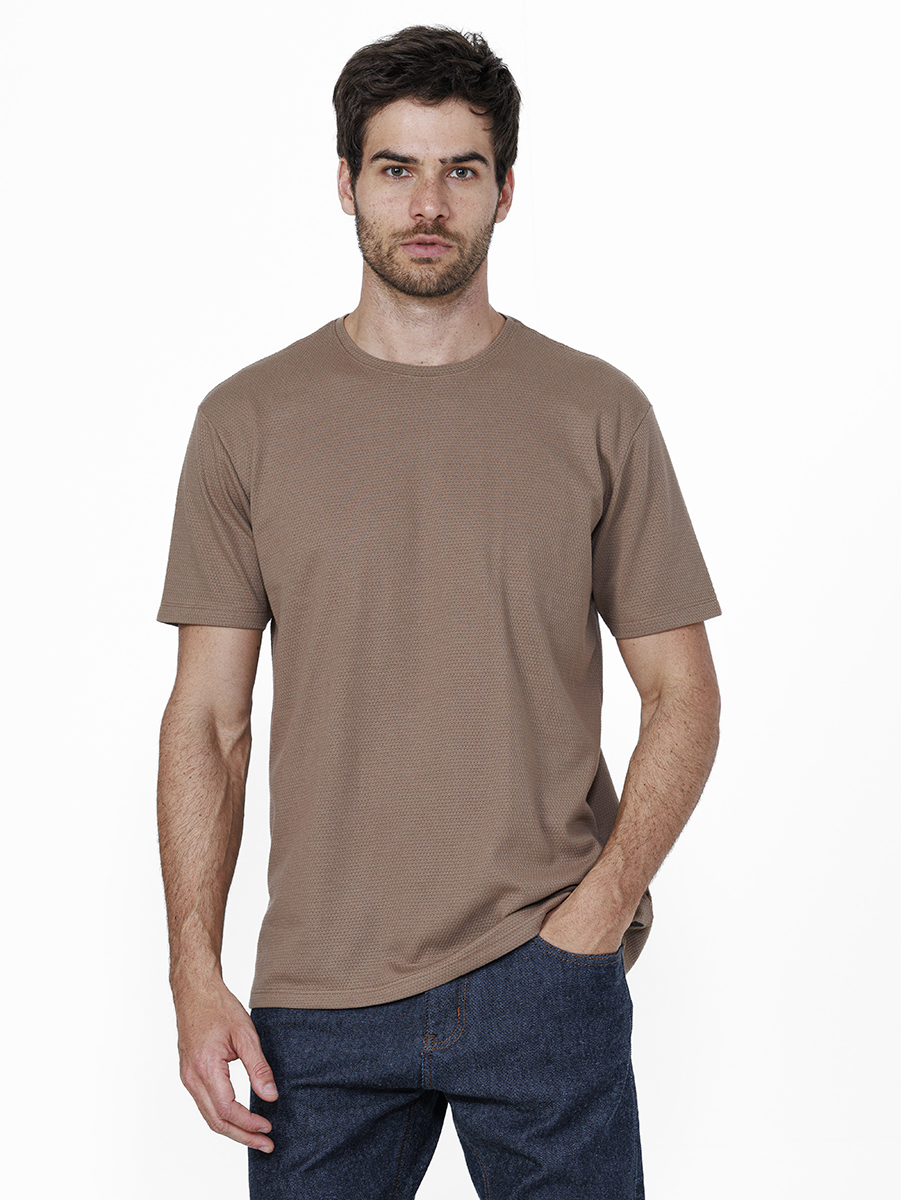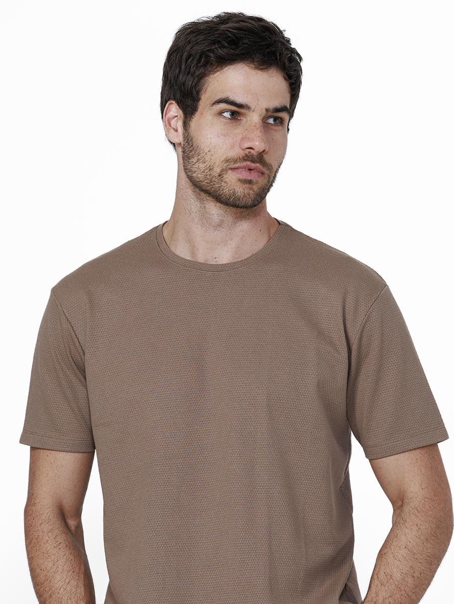 A T-shirt em malha honey se destaca pela textura em favo, marcante e diferenciada, que adiciona mais personalidade ao visual, oferecendo conforto e leveza para o uso no dia a dia.