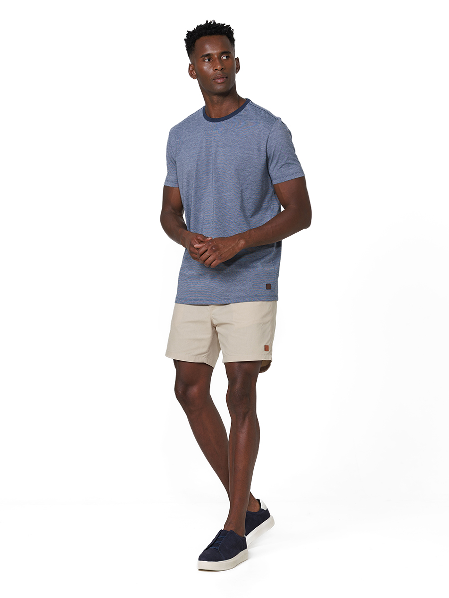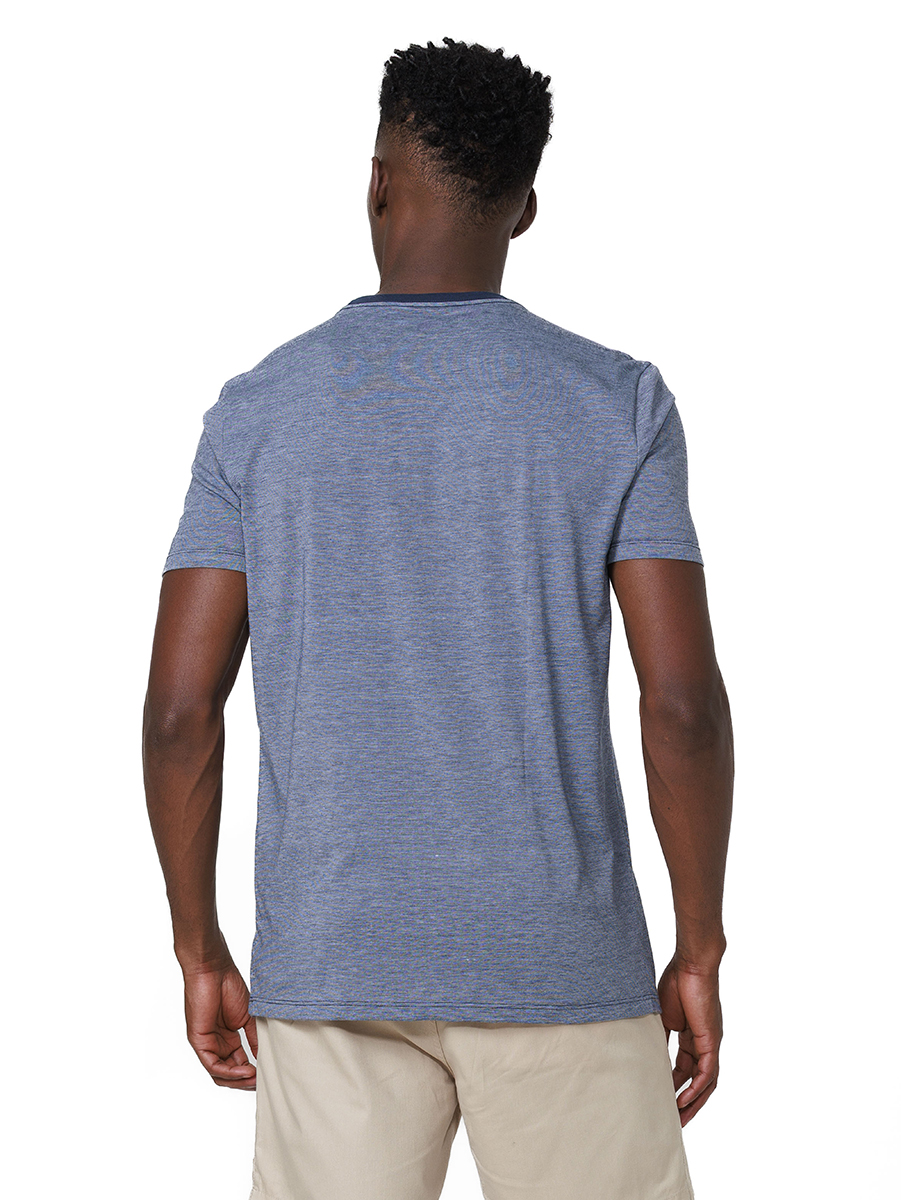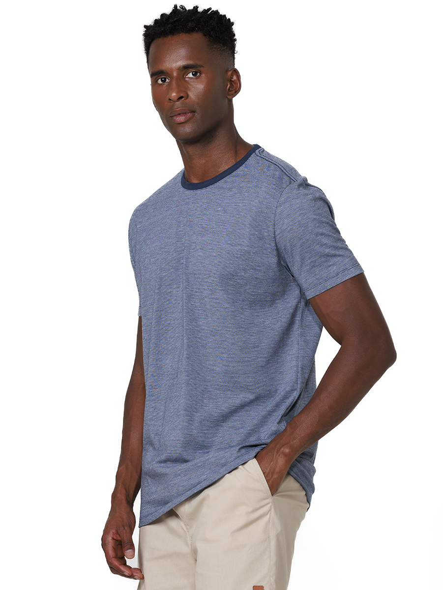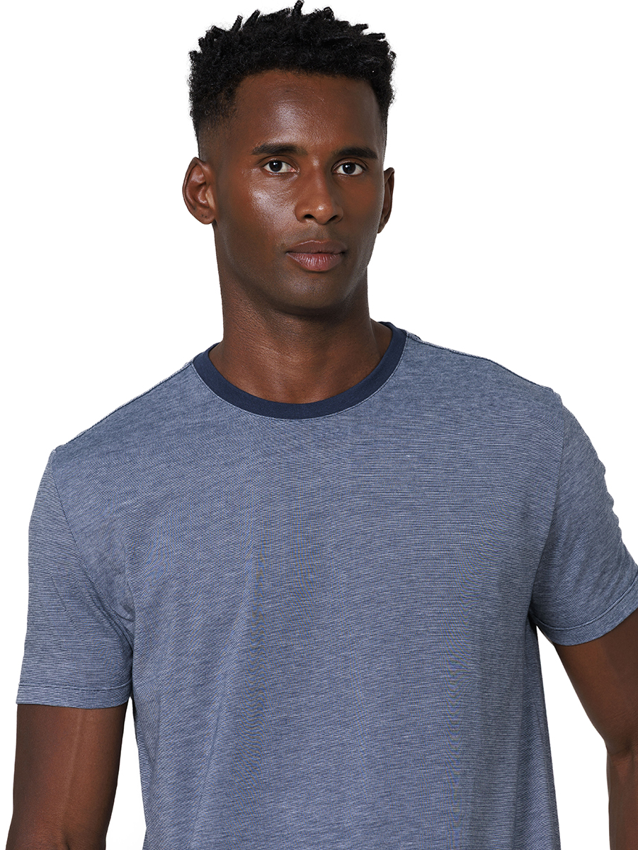 T-shirt em malha fil a fil, desenvolvida com a mistura de fios de cores diferentes em algodão e poliéster, resultando no clássico aspecto falso liso, discreto, mas com personalidade.