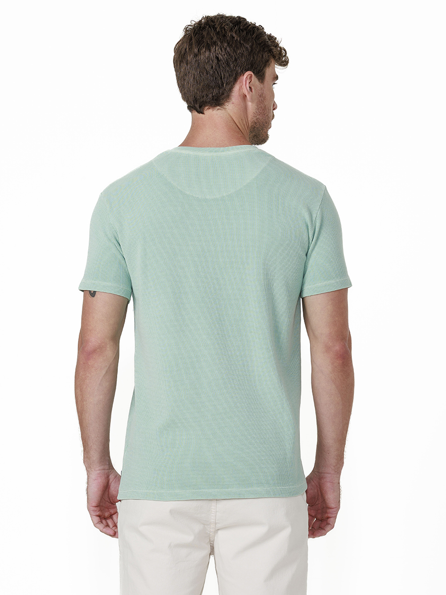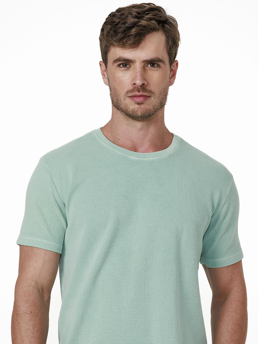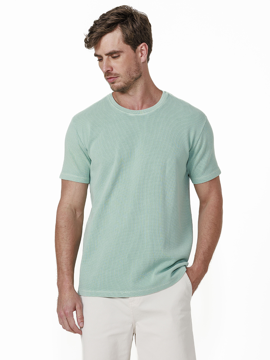 T-shirt Quadrillet Stone 100% algodão, com cores tingidas e stonadas (desgastadas) após a peça ser costurada.