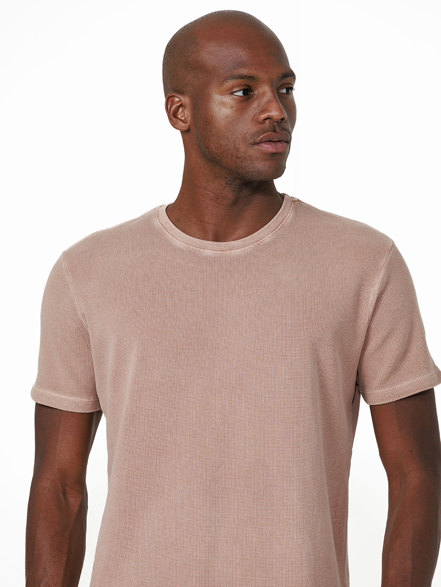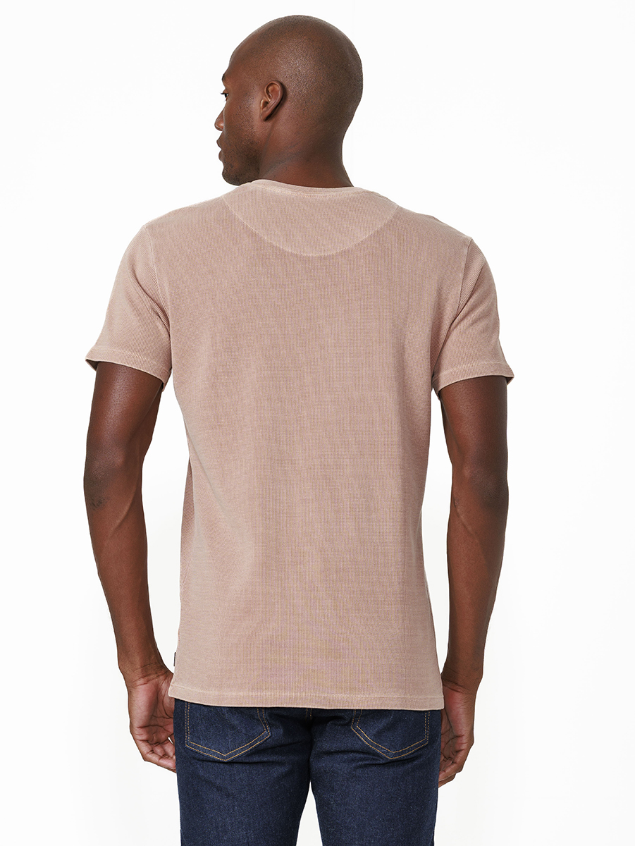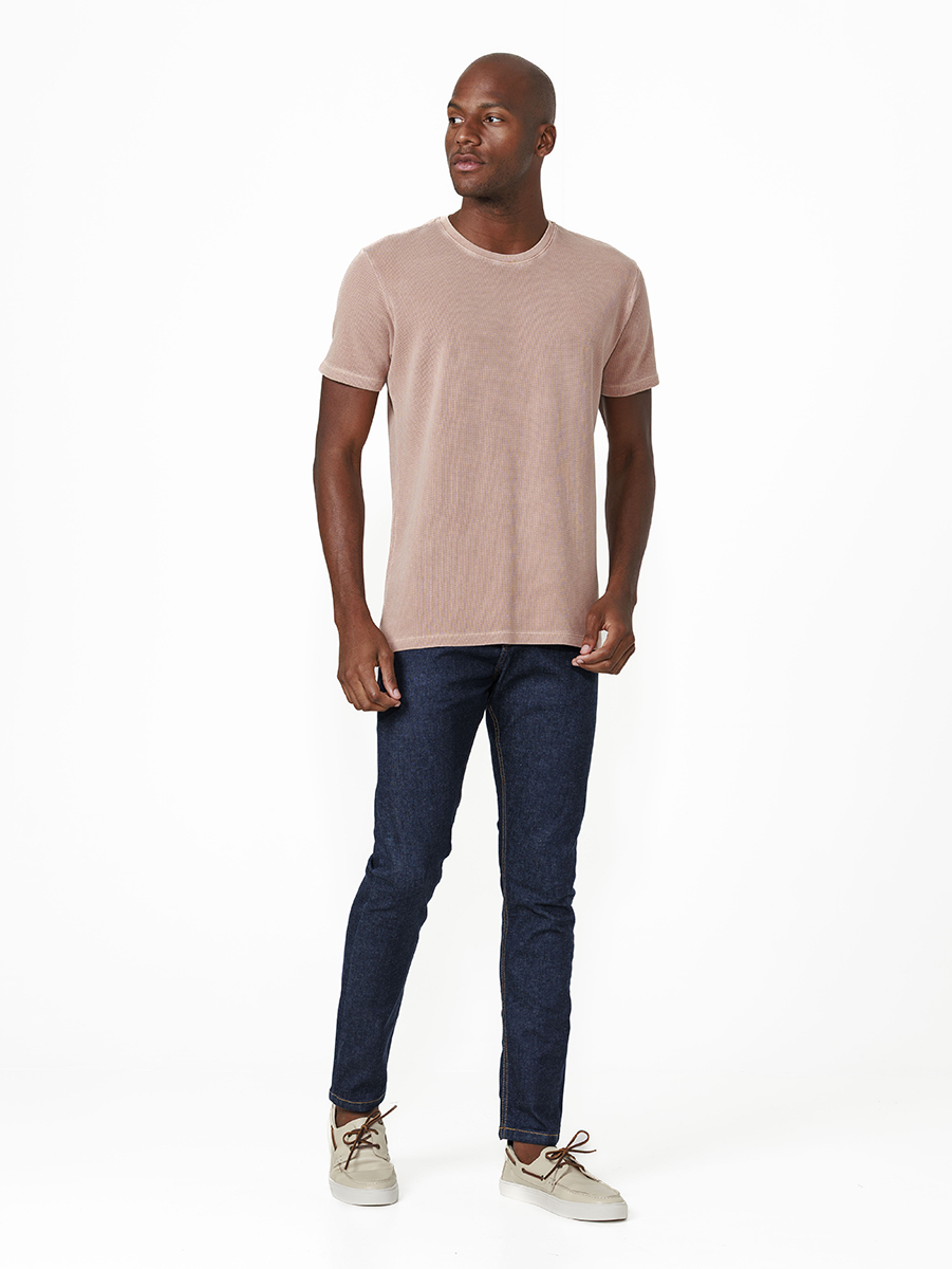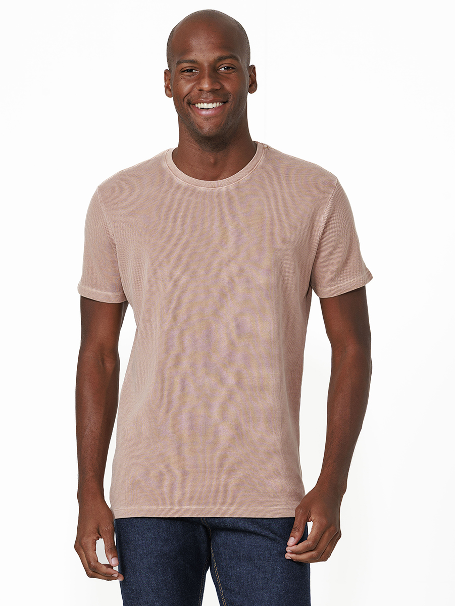 T-shirt Quadrillet Stone 100% algodão, com cores tingidas e stonadas (desgastadas) após a peça ser costurada.