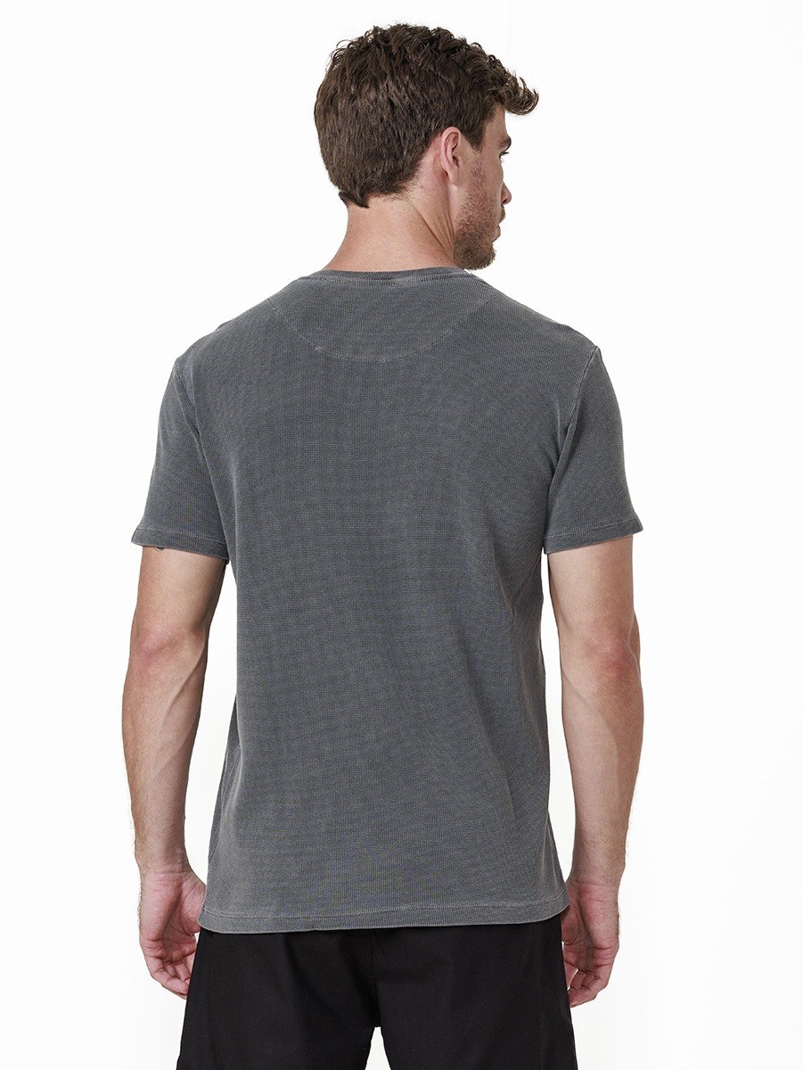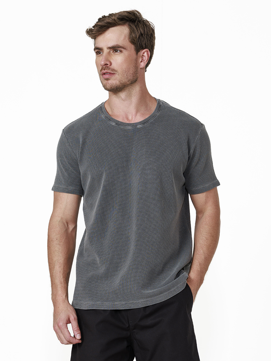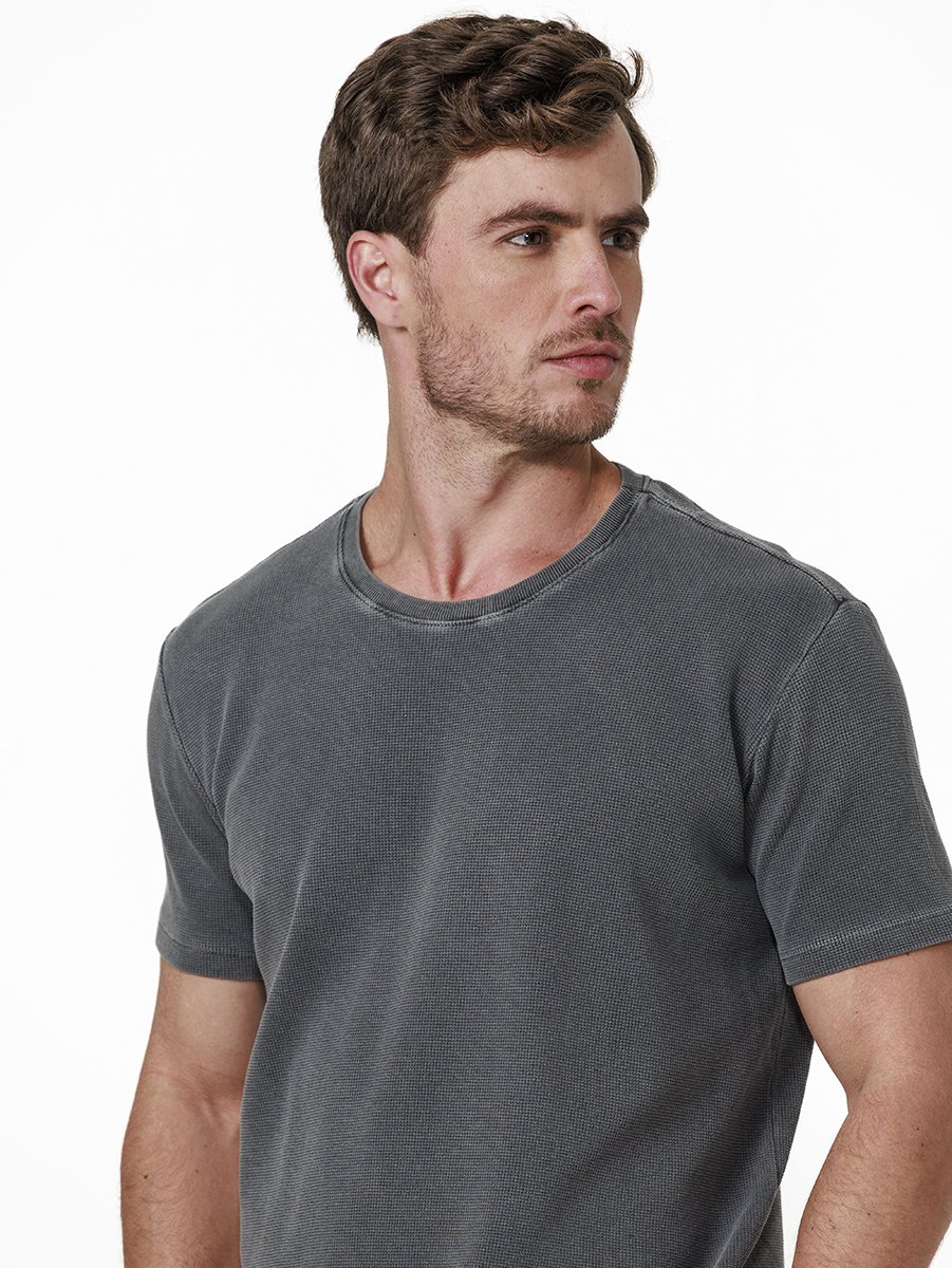 T-shirt Quadrillet Stone 100% algodão, com cores tingidas e stonadas (desgastadas) após a peça ser costurada.