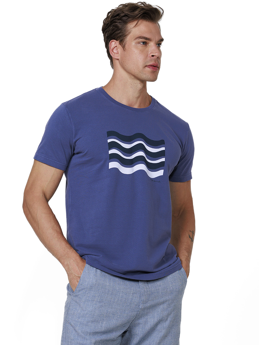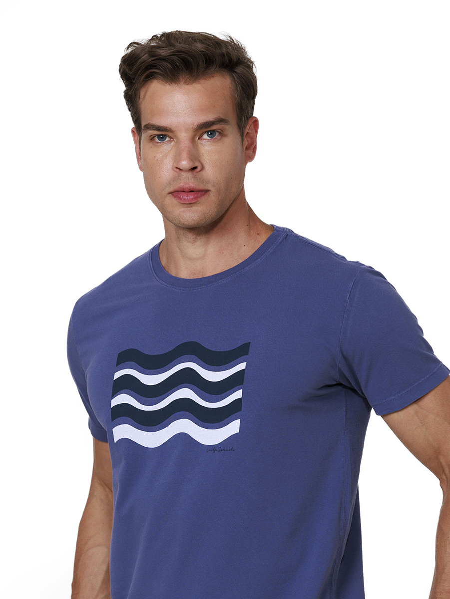A estampa em silk, formada por ondas em tons de azul, adiciona um toque gráfico que remete ao movimento das ondas do mar.